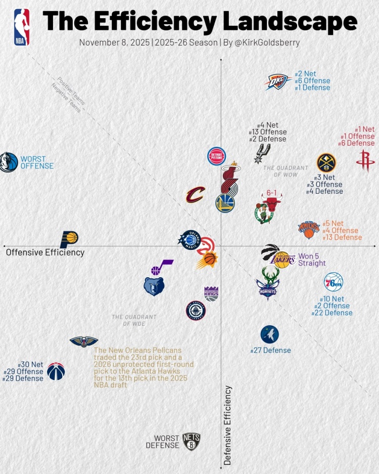 Today, data expert Kirk Goldsberry updated the team's offensive and defensive efficiency table this season. In the chart, the Rockets rank first in net efficiency; the Thunder rank second in net efficiency, but first in defensive efficiency; the Mavericks and Nets rank last in offensive efficiency and defensive efficiency respectively. The Bulls' offensive and defensive efficiency is not outstanding, but their record (6-1) is outstanding.