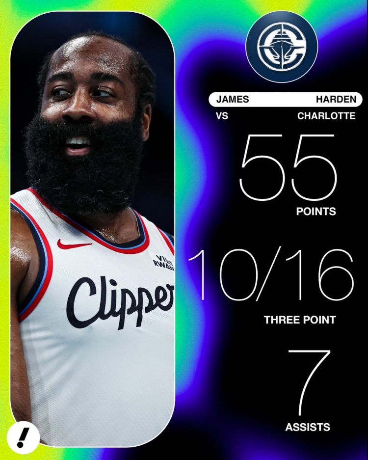 In the NBA regular season, the Clippers defeated the Hornets 131-116. In the entire game, Clippers star Harden played 35 minutes, making 17 of 26 shots, 10 of 16 three-pointers, scoring 55 points, 3 rebounds, 7 assists and 1 steal. The Clippers’ official post-game update: This is a post praising James Harden. No accompanying pictures.