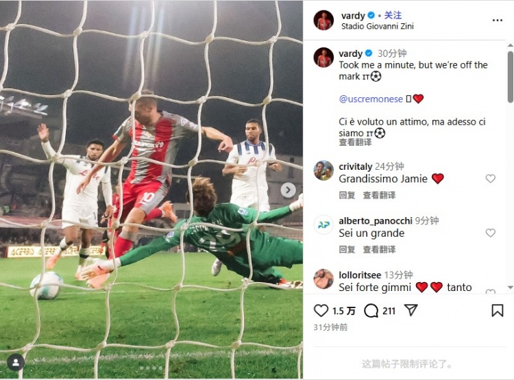 Vardy posted on Instagram today to celebrate his first goal in Cremonese's career. Early this morning, Cremonese drew 1-1 with Atalanta in Serie A. Vardy scored in the game. This was his first goal after joining the team. After the game, the 38-year-old England veteran posted a photo of the moment he scored and wrote: "It took me a while, but now I finally scored the first goal."