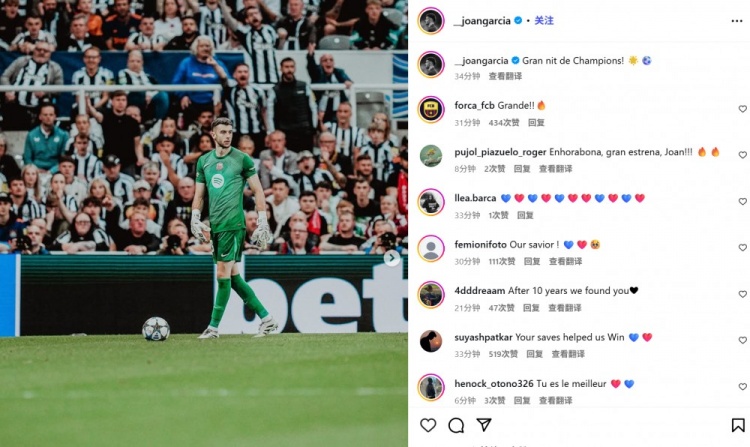 Barcelona beat Newcastle 2-1 away game last night's Champions League focus match, and new goalkeeper Joan Garcia performed well and contributed 5 saves. He also posted his game photos after the game and commemorated his Champions League debut: "Great Champions League Night!"