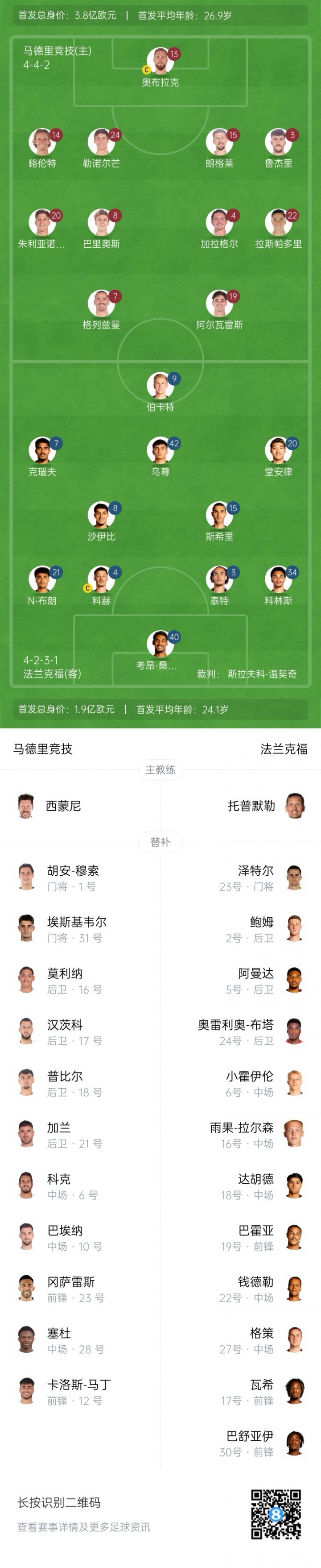On Wednesday, October 1, 03:00, the second round of the Champions League phase, Atletico Madrid played against Frankfurt at home. Currently, both sides have announced the starting lineup for this game. In terms of Atletico Madrid starting, Griezmann partnered with Alvarez, and Simeone Jr. started; in terms of Frankfurt, Don Anlu played!