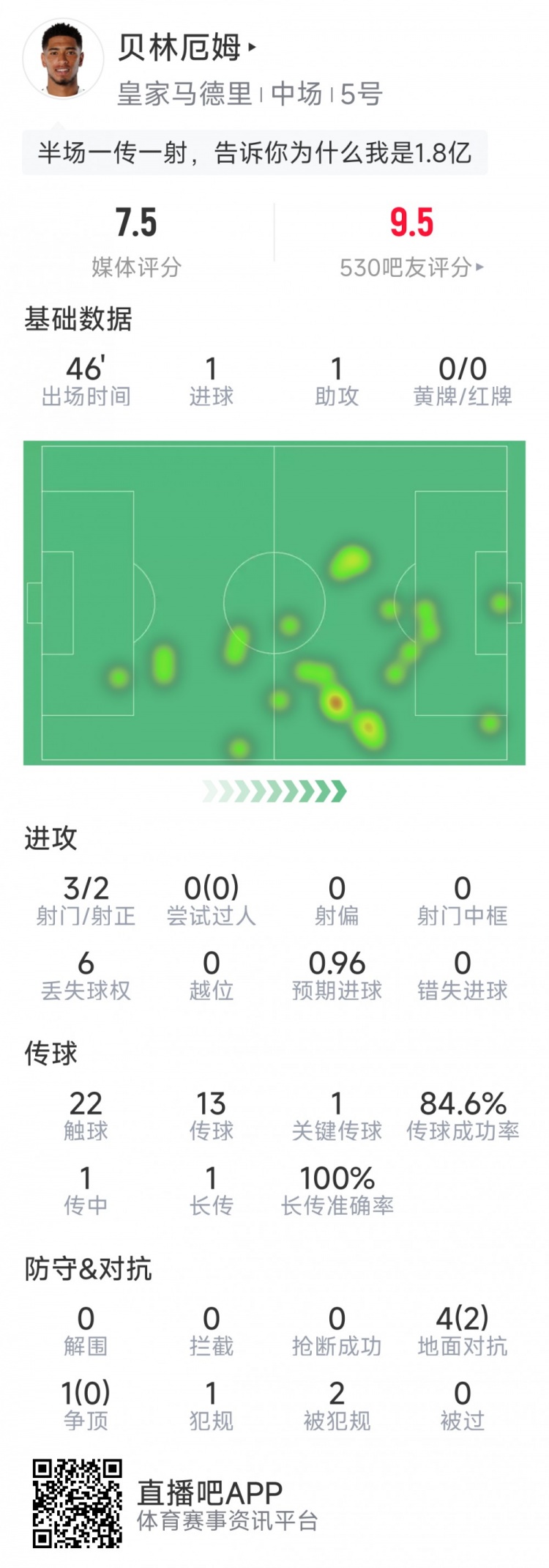 KuaSports > Football > Bellingham s halftime statistics: 1 goal, 1 assist, 3 shots, 2 goals, 1 key pass, rating 7.5 points