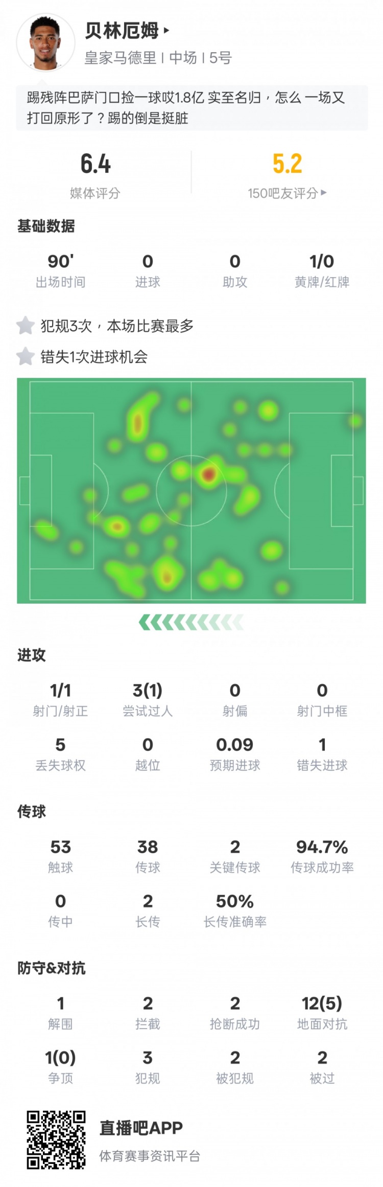 Bellingham s statistics for this game: 1 missed goal opportunity + 1 key pass, 2 interceptions, 2 steals, rating 6.4
