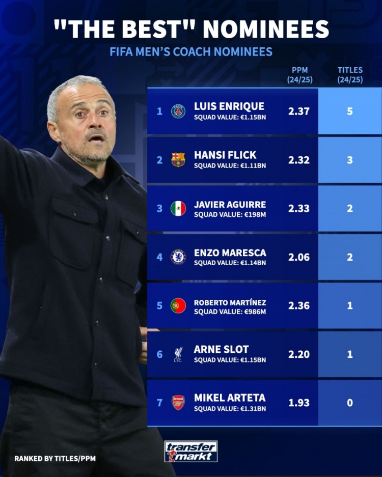 FIFA announced the shortlist of candidates for the Best Men's Football Coach of the Year, and the German transfer market listed the results of the finalists last season. The candidate for the best coach in Germany last season: Enrique (Paris Saint-Germain) Team value - 1.15 billion euros Average points per game - 2.37 Champions - Ligue 1, French Cup, French Super Cup, Champions League, UEFA Super Cup Flick (Barcelona) Team value ——1.11 billion euros Average points per game--2.32 Champions--La Liga, Copa del Rey, Spanish Super Cup Aguirre (Mexico) Team worth--198 million euros Average points per game--2.33 Champions--Gold Cup, North American and Caribbean Nations League Horses Resca (Chelsea) Team value - 1.14 billion euros Average points per game-2.06 Championship-UEFA, Club World Cup Roberto Martinez (Portugal) Team value--986 million euros Average points per game--2.36 Championship-Europe United Sloter (Liverpool) Team value - 1.15 billion euros Average points per game-2.20 Championship--Premier League Arteta (Arsenal) Team value--1.31 billion euros Average points per game--1.93 Champions--None
