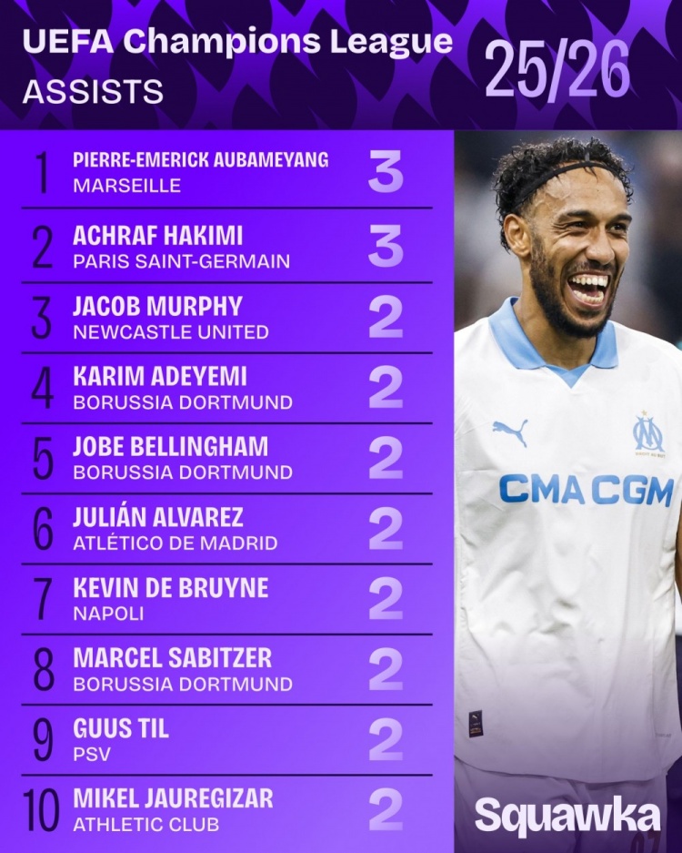 Three rounds of the Champions League have been played this season. Squawka has compiled the assist list so far. Marseille forward Aubameyang and Paris defender Ashraf both have 3 assists, ranking in the top two. Champions League assists list this season: 1. Aubameyang (Marseille): 3 2. Achraf (Paris Saint-Germain): 3 3. Murphy (Newcastle): 2 4. Adeyemi (Dortmund): 2 5. Job Bellingham ( Dortmund): 2 6. Alvarez (Atletico Madrid): 2 7. De Bruyne (Naples): 2 8. Sabitzer (Dortmund): 2 9. Thiel (Eindhoven): 2 10. Jaureguisar (Athletic Bilbao): 2