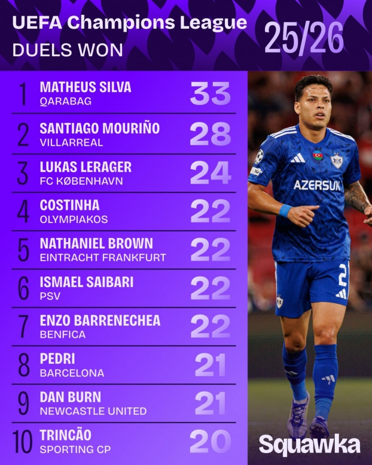 Three rounds have been played in the Champions League this season. Squawka has compiled the list of wins so far. Karabakh defender Mathews Silva ranks first with 33 times, and Villarreal defender Santiago Mourinho ranks second with 28 times. 1. Matthews Silva (Karabakh): 33 2. Santiago Mourinho (Villarreal): 28 3. Lucas Leilage (Copenhagen): 24 4. Costinha (Olympiacos): 22 5. Brown (France) Frankfurt): 22 6. Sebari (Eindhoven): 22 7. Barrenecchea (Benfica): 22 8. Pedri (Barcelona): 21 9. Dan Byrne (Newcastle): 21 10. Trincao (Sports CP): 20