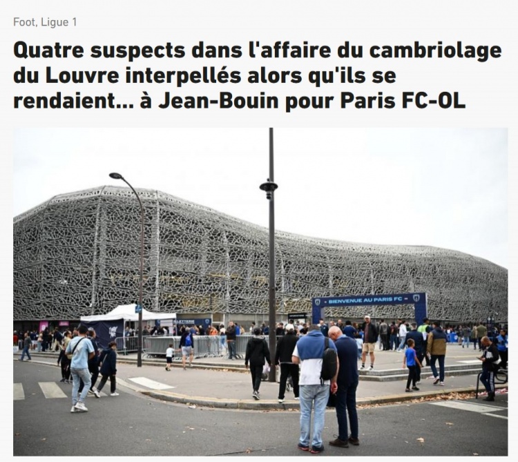 According to French media reports, five new suspects were arrested in the Louvre theft case, and four of them were going to the Jean-Bouin Stadium to watch the Ligue 1 match between Paris FC and Lyon when they were arrested.  In this game, Paris FC used amazing resilience to draw with Lyon at home after falling behind 0-3, and something unexpected happened outside the game. According to Franceinfo, four men were arrested by police near the Stade Jean Bouin on suspicion of involvement in the recent theft at the Louvre, while another suspect was arrested in La Gournave.  The Paris prosecutor explained in an interview with RTL: "One of them is indeed a target of the investigators because we collected his DNA. As for the other detained people, they may provide us with information about the progress of the case."   According to reports, one of the suspects was one of the motorcycle drivers who helped the thieves escape, and then they changed to a pickup vehicle on the A6 highway. According to previous reports, on October 19, four men successfully broke into the Apollo Gallery of the Louvre and stole multiple crown jewels. The stolen items were worth 88 million euros.
