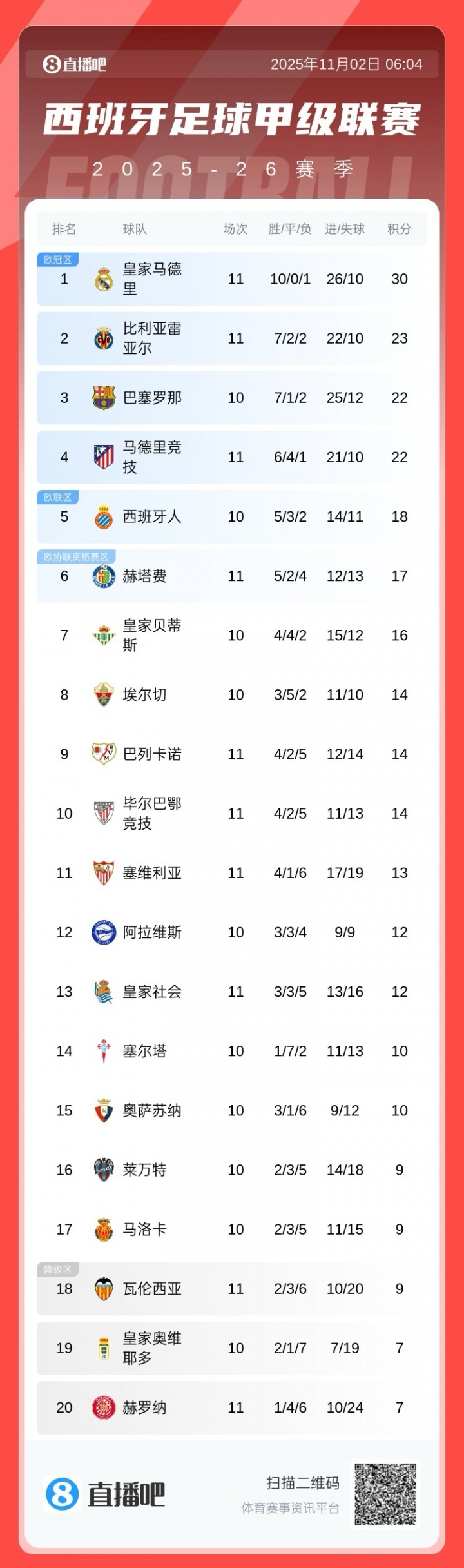 KuaSports > Football > La Liga standings: Real Madrid leads with 10 wins in 11 rounds and currently leads by 7 points, Barcelona will play tomorrow