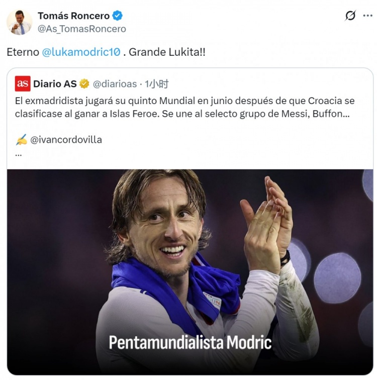 In the European preliminaries of the World Cup, Croatia defeated the Faroe Islands 3-1 to qualify for the World Cup. The 40-year-old Croatian midfielder Modric will usher in his fifth World Cup. Roncero, editor-in-chief of the Spanish media "AS" and a Real Madrid fan, forwarded the relevant news with the text: "The eternal Modric, the great Luka (Modric)!"