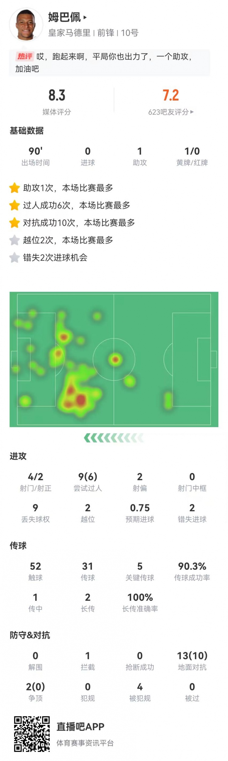 Real Madrid drew 2-2 with Elche in this round of La Liga. Mbappe's statistics for this game are as follows: Played the whole game in the first round 1 assist 4 shots, 2 goals 9 dribbles, 6 successes 9 lost the ball 2 offside expected goals 0.75 2 missed goals 52 touches 31 passes, success rate 90.3% 5 key passes 1 cross 2 long passes, 2 successes 1 interceptions 15 confrontations, 10 successes 4 fouls rated 8.3 points