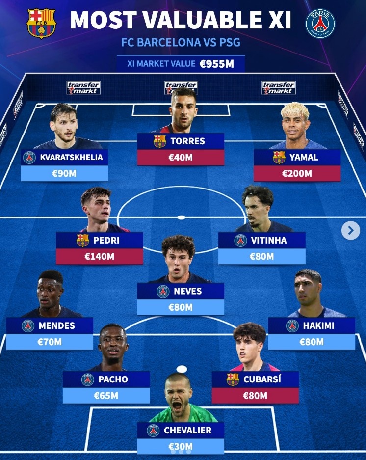Paris + Barcelona currently has the highest value 11 players: Yamal leads, K77 and Pedri are on the list
