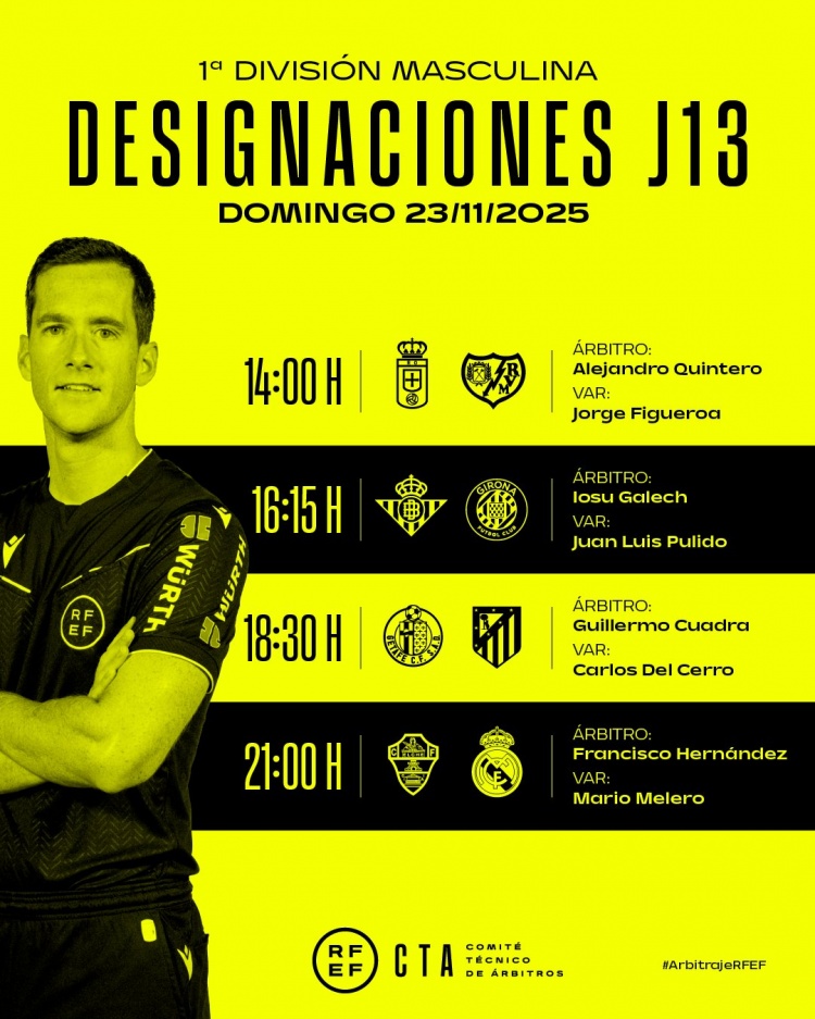 La Liga officially announced the refereeing arrangements for the game on November 23. F. Hernandez will officiate Elche vs. Real Madrid. Referee arrangements for the November 23 match: Real Oviedo vs Rayo Vallecano - Referee: Quintero, VAR referee: Figueroa Betis vs Girona - Referee: Galeh, VAR referee: Pulido Getafe vs Atletico Madrid - Referee: Cuadra, VAR Referee: Carlos Del Cerro Elche vs Real Madrid - Referee: Francisco Hernandez, VAR Referee: Mario Melero