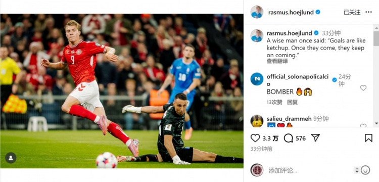 In the European preliminaries of the World Cup, Hoylen scored to help Denmark defeat Greece 3-1. Hoylen scored goals in 4 consecutive games, showing a good state. He wrote on social media: "A wise man once said - goals are like ketchup, once the bottle is opened, there will be an endless supply."