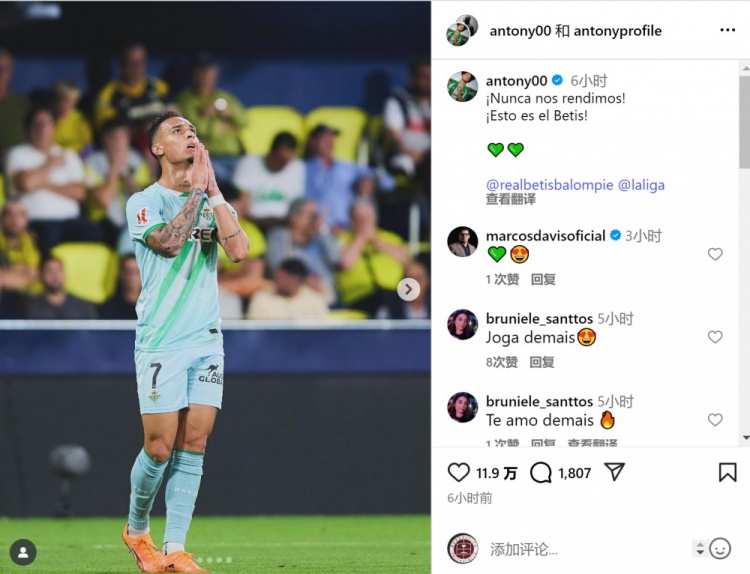 In the 9th round of La Liga, Anthony scored twice and scored the winning goal in the 93rd minute. Betis drew 2-2 with Villarreal after falling behind by two goals. Anthony posted a photo celebrating his goal on social media with the text: "We will never give up, this is Betis!"