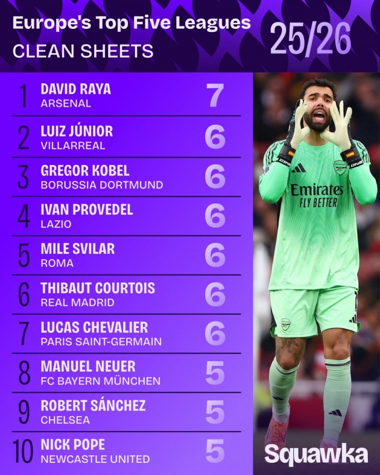 The war in the five major leagues is about to resume. The data agency squakwa also compiled the list of clean sheets among goalkeepers in the five major leagues this season, with Gunners goalkeeper Raya ranking first. List of goalkeeper clean sheets in the five major leagues this season: 1. David Raya, Arsenal, 7 games 2. Luis Junior, Villarreal, 6 games 3. Gregor Kerber, Dortmund, 6 games 4. Ivan Providel, Lazio, 6 games 5. Miley Svilral , Roma, 6 games 6. Thibault Courtois, Real Madrid, 6 games 7. Lucas Chevalier, Paris Saint-Germain, 6 games 8. Manuel Neuer, Bayern Munich, 5 games 9. Robert Sanchez, Chelsea, 5 games 10. Nick Pope, Newcastle United, 5 games