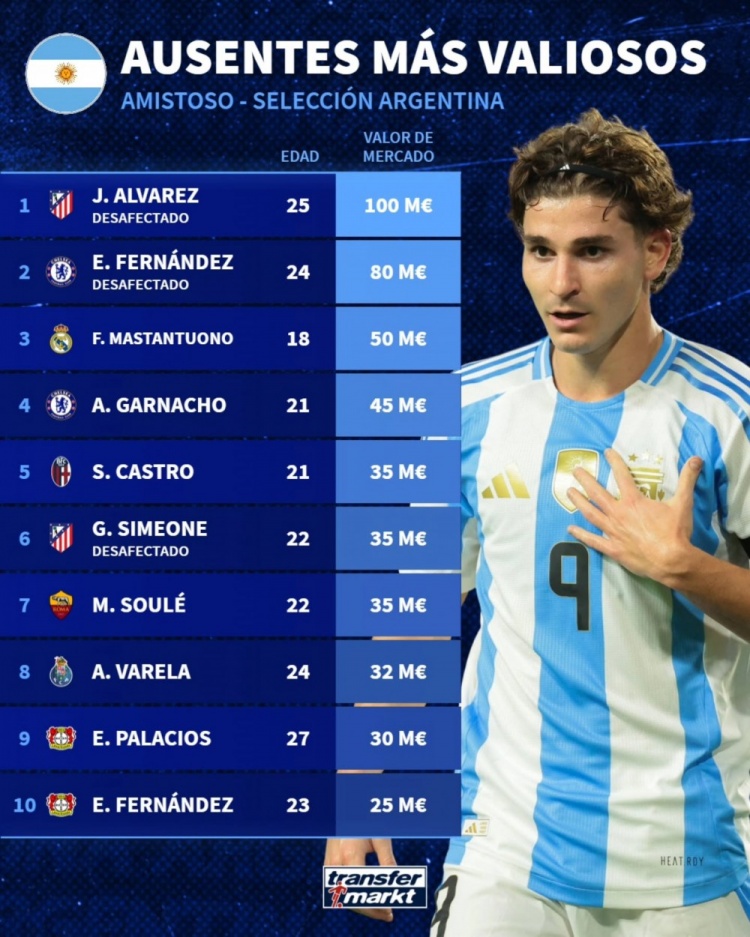 The value list of Argentina players who are absent from this issue: Spider-Man tops the list with 100 million euros, Enzo with 80 million euros