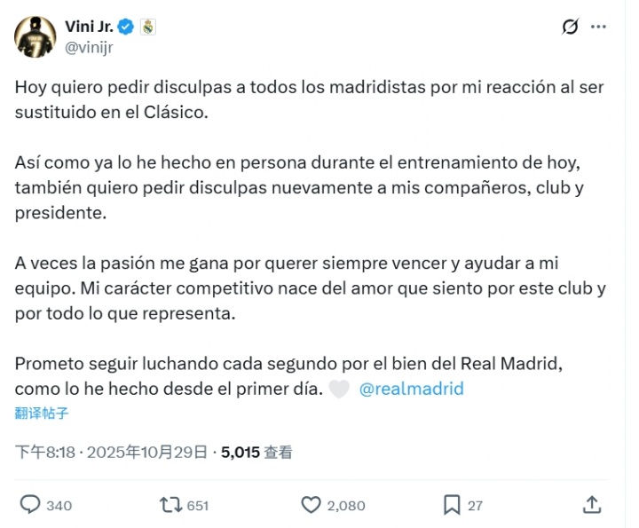 Vinicius was replaced in the national derby due to dissatisfaction and walked directly back to the locker room. Today, Vinicius's social media apologized to Real Madrid fans, teammates, club and president for being dissatisfied with being substituted. Vinicius Social Media: Today, I would like to apologize to all Madrid fans for my reaction when I was substituted in the El Clasico. As I did personally in training today, I also want to apologize again to my teammates, the club and the president. Sometimes my enthusiasm can make me lose my mind; I am always eager to win and help my team. My competitiveness stems from my love for this club and everything it represents. I promise to fight every moment for Real Madrid as I have always done from day one. In the 10th round of La Liga's El Clasico, Real Madrid faced Barcelona at home. In the 72nd minute, Vinicius was replaced, chattering all the way, and went straight back to the locker room after the game. Real Madrid replaces Rodrigo.