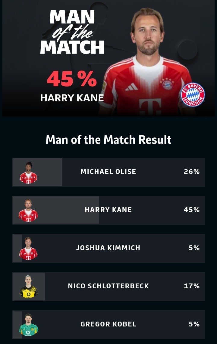 With 1 goal and 1 key pass, Kane was elected the best of the match in Bayern s 2-1 Dortmund game